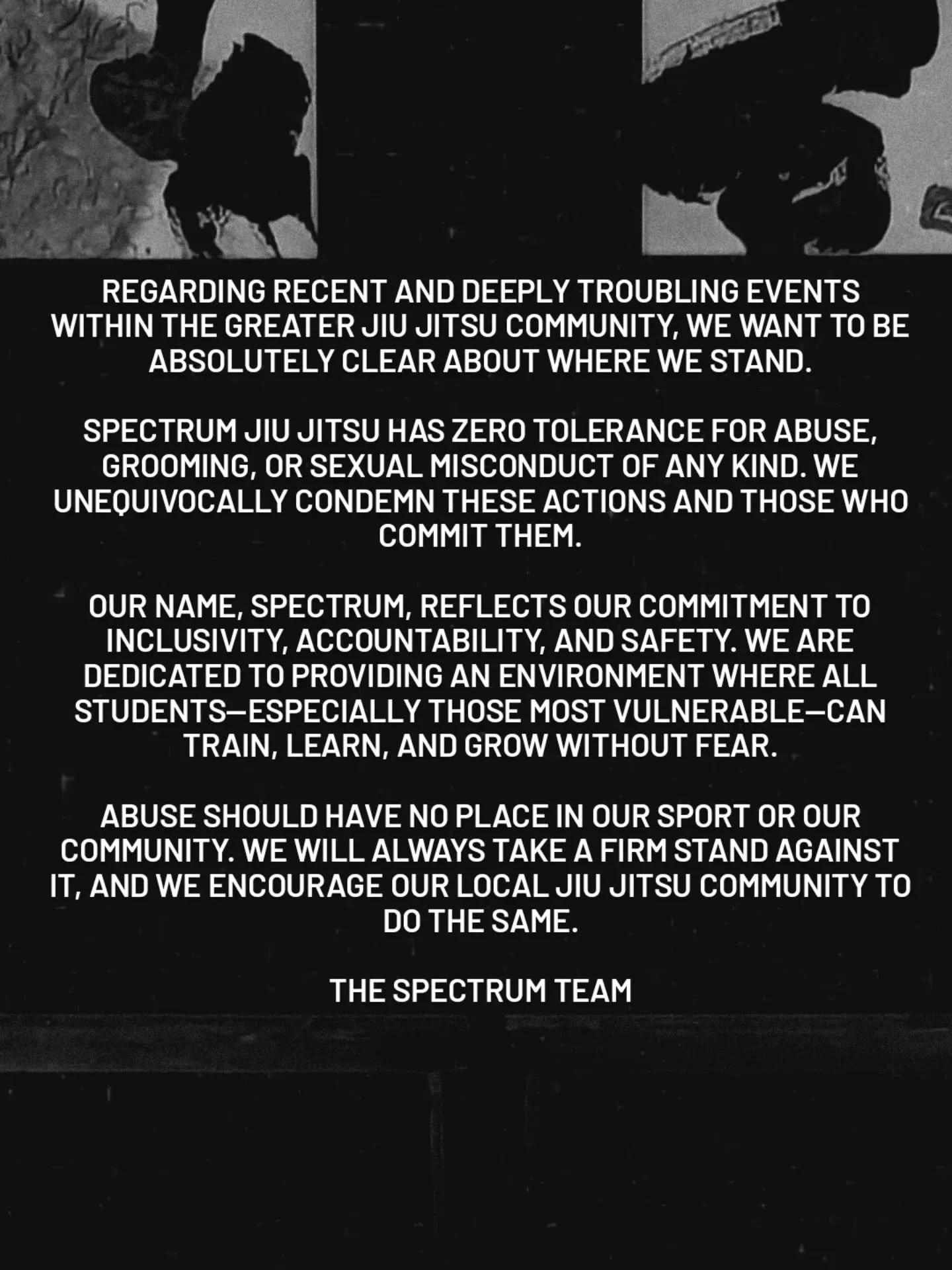At Spectrum Jiu Jitsu we provide instruction for all walks of life: from competitors to fitness or self-defense minded individuals, to people just looking for a fun new hobby. At Spectrum, it is our mission to help you reach your goals, wherever they may fall on the spectrum.